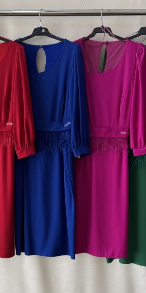 VESTIDO VITTORIA CORTO LISO MANGA FRANCESA CINTURON PLUMAS