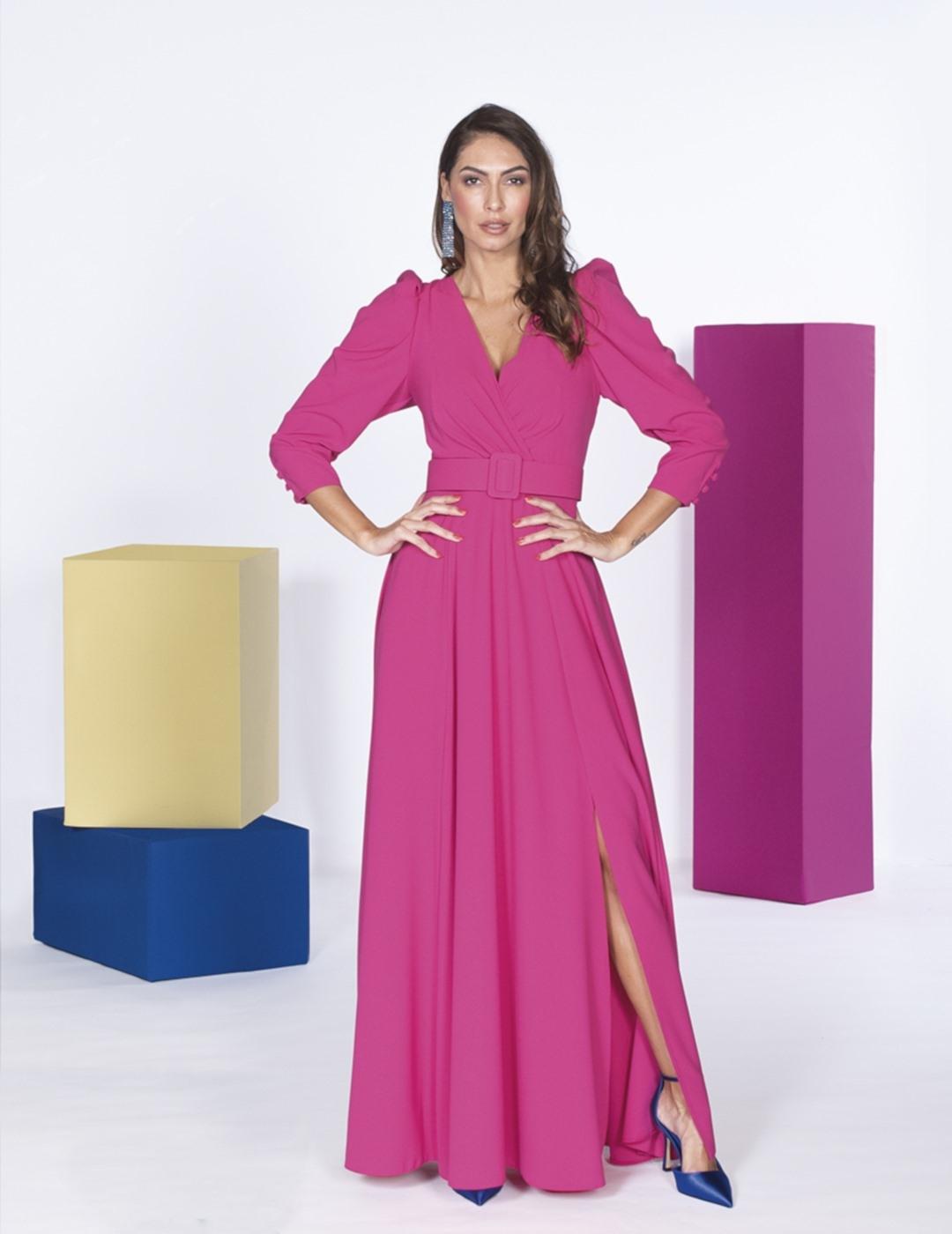 Vestido largo cuerpo ajustado con escote cruzado, Espalda cerrada con cremallera invisible y manga tres cuartos abullonada con botones.